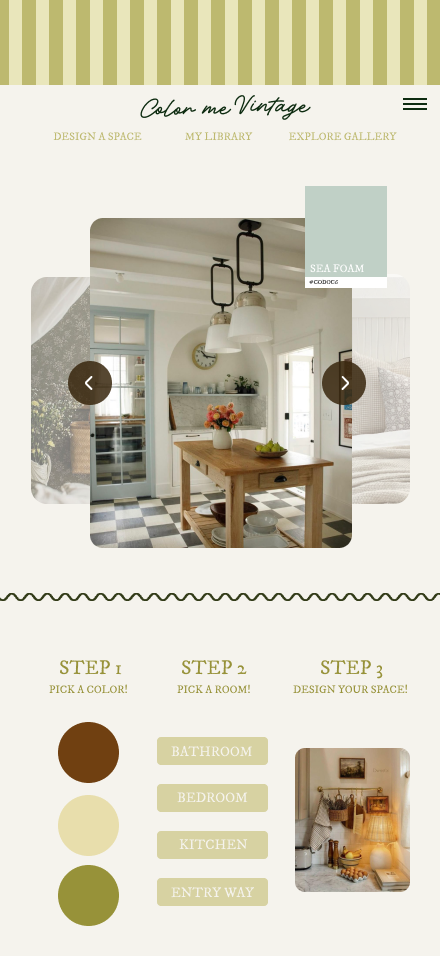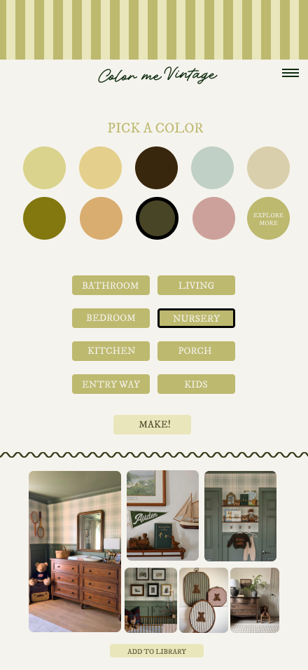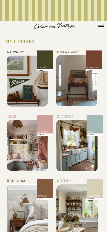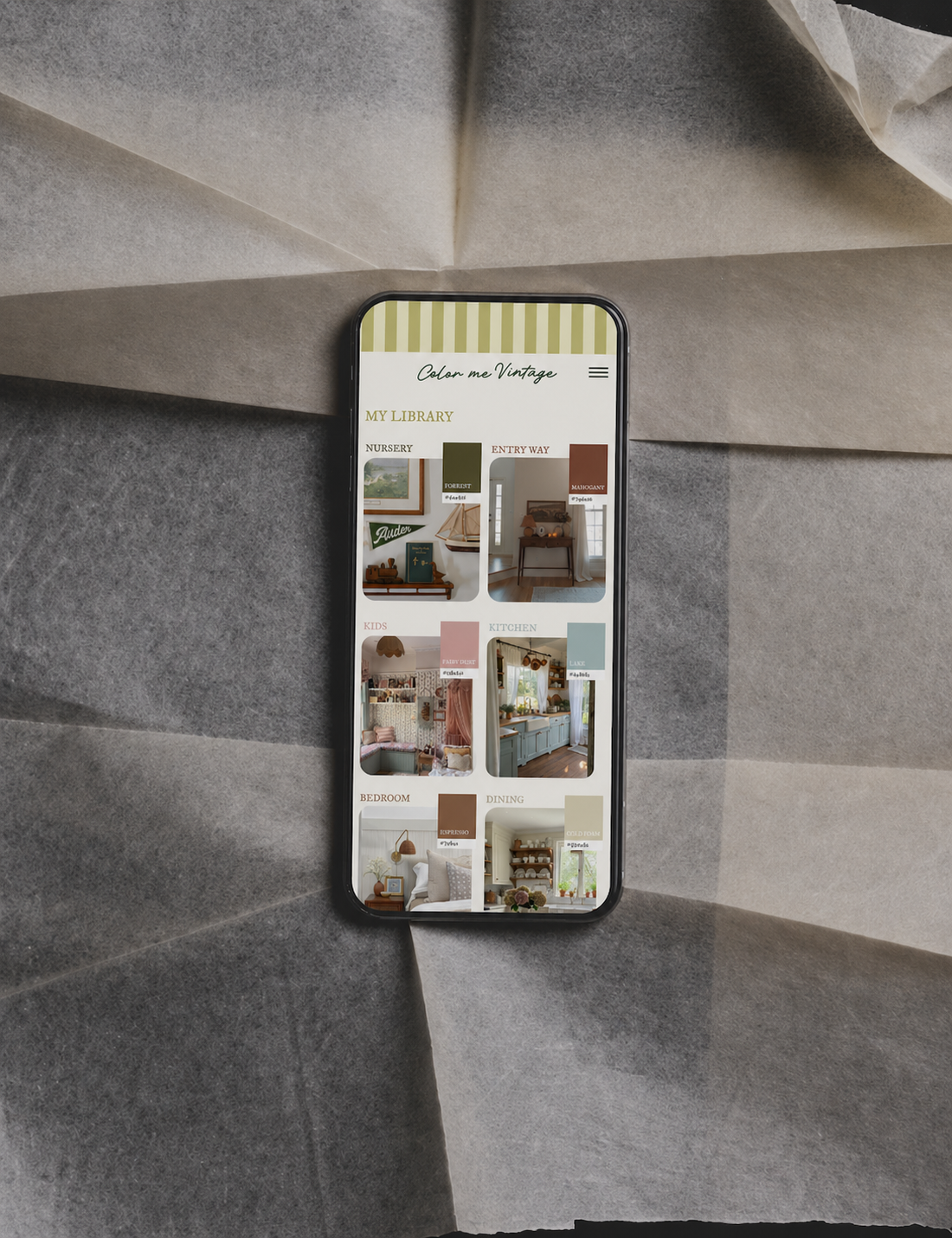 Color Me Vintage, an app for home decor enthusiasts, helps users visualize and style spaces through color selection and room customization. Users choose a color and a room they want to design, and the app generates original, curated styling content focused on a cozy, vintage aesthetic. To drive continued engagement, the app incorporates a gamification aspect by unlocking new rooms, such as hallways or coffee bars, as users create additional designs and explore new color combinations and patterns.